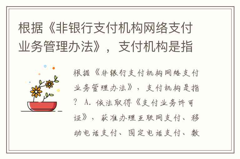 根据《非银行支付机构网络支付业务管理办法》,支付机构是指? A. 依法取得《支付业务许可证》,获准办理互联网支付、移动电话支付、固定电话支付、数字电视支付等网络支付业务的非银行机构 B. 依法取得《支付业务许可证》,获准办理互联网支付、移动电话支付等网络支付业务的机构 C. 获准办理互联网支付、移动电话支付、固定电话支付、数字电视支付等网络支付业务的非银行机构 D. 依法取得《支付业务许可证》,获准办理互联网支付、移动电话支付等网络支付业务的非银行机构