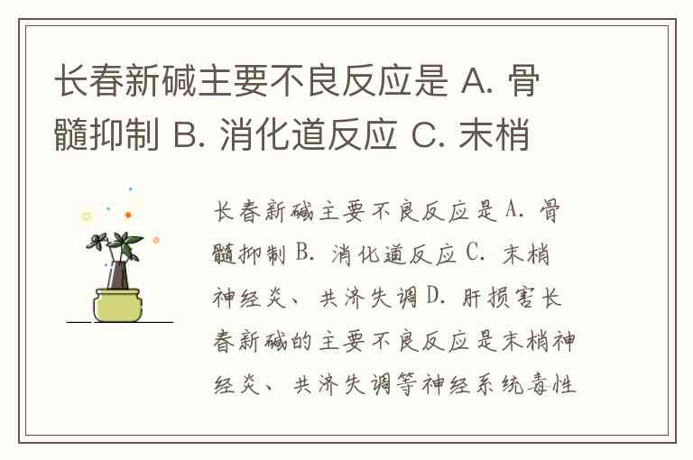 长春新碱主要不良反应是 A. 骨髓抑制 B. 消化道反应 C. 末梢神经炎、共济失调 D. 肝损害