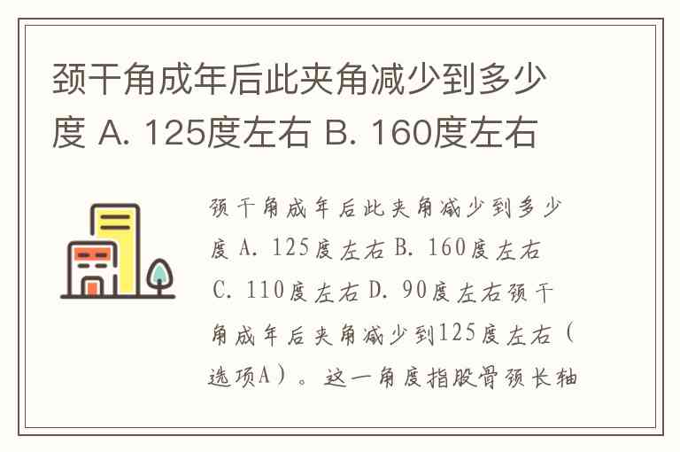 颈干角成年后此夹角减少到多少度 A. 125度左右 B. 160度左右 C. 110度左右 D. 90度左右