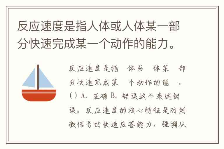 反应速度是指⼈体或⼈体某⼀部分快速完成某⼀个动作的能⼒。( ) A. 正确 B. 错误