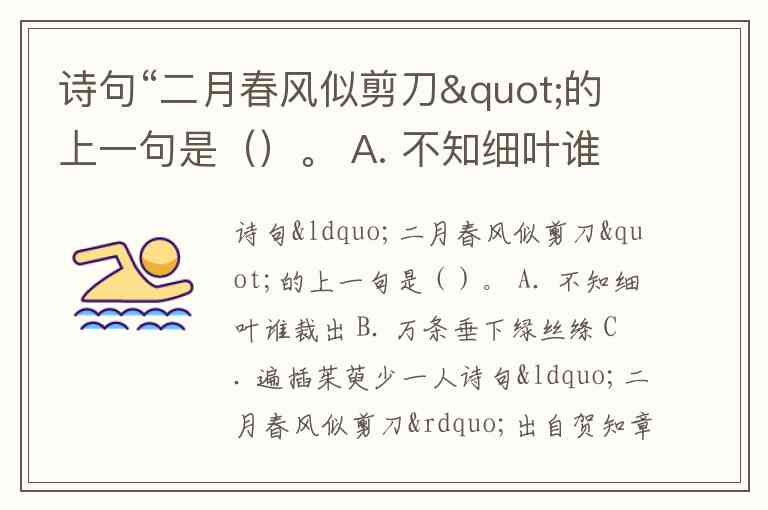 诗句“二月春风似剪刀"的上一句是()。 A. 不知细叶谁裁出 B. 万条垂下绿丝绦 C. 遍插茱萸少一人