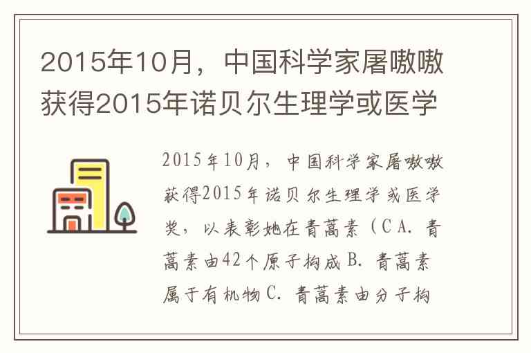 2015年10月,中国科学家屠嗷嗷获得2015年诺贝尔生理学或医学奖,以表彰她在青蒿素(C A. 青蒿素由42个原子构成 B. 青蒿素属于有机物 C. 青蒿素由分子构成 D. 青蒿素中碳元素的质量分数最大