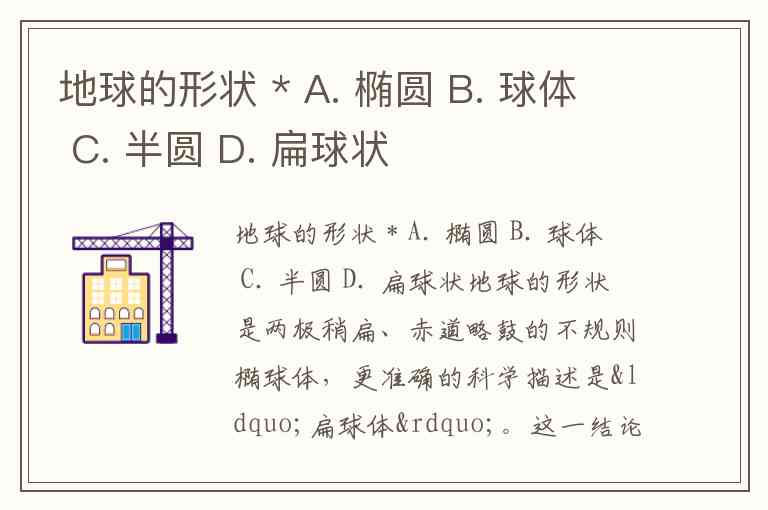 地球的形状 * A. 椭圆 B. 球体 C. 半圆 D. 扁球状