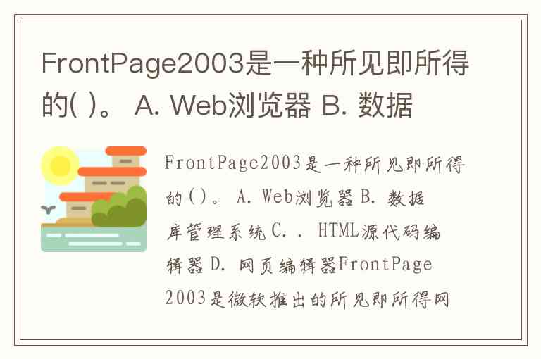 FrontPage2003是一种所见即所得的( )。 A. Web浏览器 B. 数据库管理系统 C. .HTML源代码编辑器 D. 网页编辑器