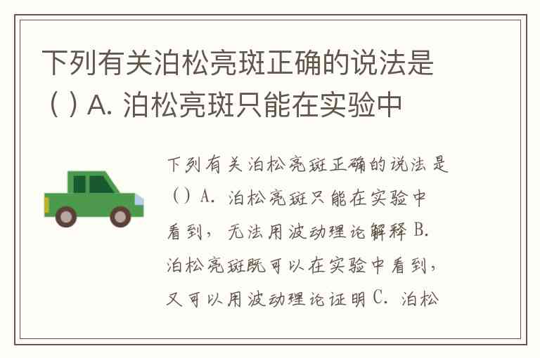 下列有关泊松亮斑正确的说法是 ( ) A. 泊松亮斑只能在实验中看到,无法用波动理论解释 B. 泊松亮斑既可以在实验中看到,又可以用波动理论证明 C. 泊松亮斑只是一种理论假设,没有被实验证明 D. 泊松亮斑是指用光照射不透明的圆盘时阴影的中心出现一个亮斑