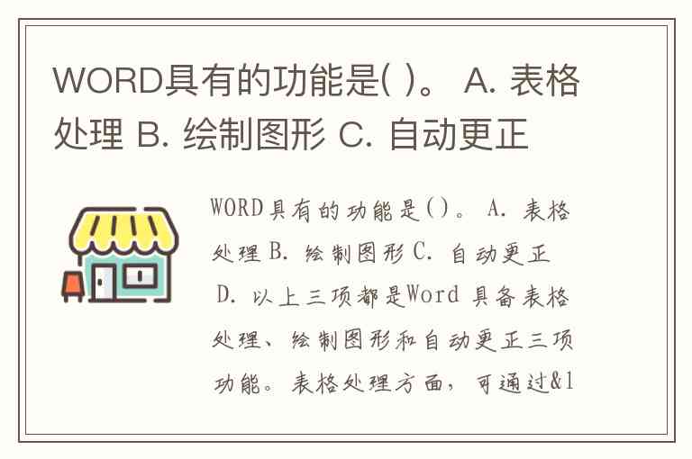 WORD具有的功能是( )。 A. 表格处理 B. 绘制图形 C. 自动更正 D. 以上三项都是
