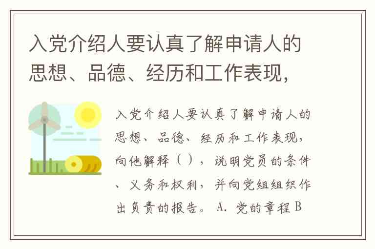 入党介绍人要认真了解申请人的思想、品德、经历和工作表现,向他解释(),说明党员的条件、义务和权利,并向党组组织作出负责的报告。 A. 党的章程 B. 党的纲领 C. 党的历史 D. 党的基本路线