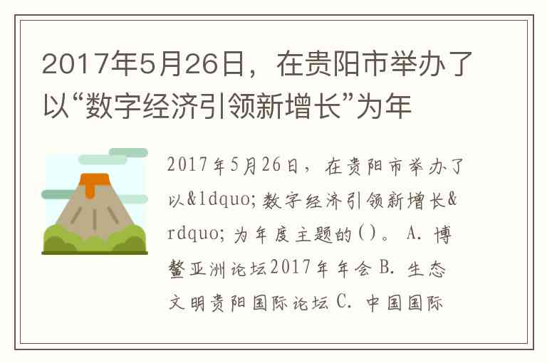 2017年5月26日,在贵阳市举办了以“数字经济引领新增长”为年度主题的( )。 A. 博鳌亚洲论坛2017年年会 B. 生态文明贵阳国际论坛 C. 中国国际大数据产业博览会 D. 二十国集团(G20)峰会