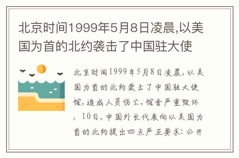 1999年5月7日午夜(北京时间5月8日凌晨),以美国为首的北约用导弹袭击中国驻南斯拉夫联盟共和国大使馆,造成馆舍严重毁坏,3人死亡、20余人受伤,遇难者包括新华社记者邵云环、光明日报记者许杏虎及夫人朱颖。中国政府当天发表严正声明,谴责这一违反《联合国宪章》和《维也纳外交关系公约》的野蛮暴行,提出最强烈抗议,并于5月10日正式向以美国为首的北约提出四点严正要求。这一事件是外交史上罕见的主权侵犯,中国政府始终坚定要求北约承担全部责任,保留采取进一步措施的权利。