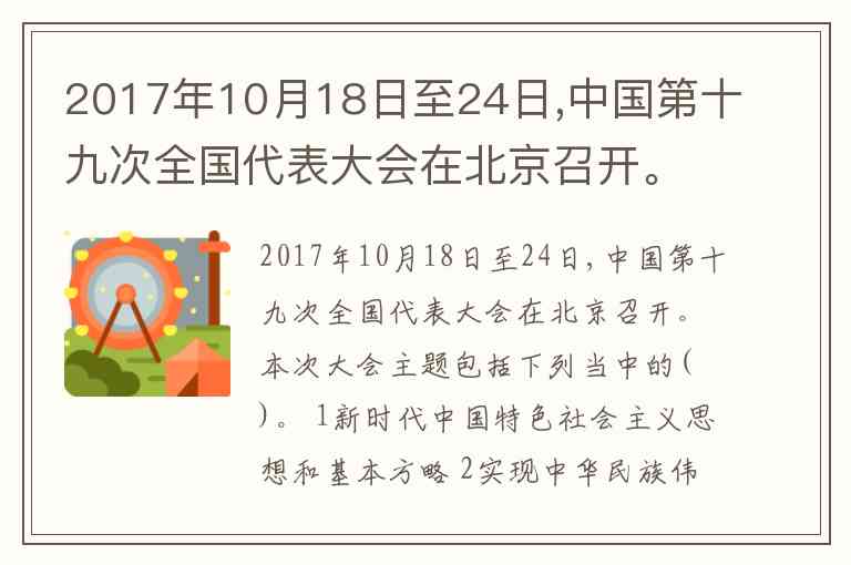 2017年10月18日至24日,中国第十九次全国代表大会在北京召开。本次大会主题包括下列当中的( )。 1新时代中国特色社会主义思想和基本方略 2实现中华民族伟大复兴的中国梦不懈奋斗 3不忘初心,牢记使命,高举中国特色社会主义伟大旗帜 4决胜全面建成小康社会,夺取新时代中国特色社会主义伟大胜利 A. ①②③ B. ①②④ C. ①③④ D. ②③④
