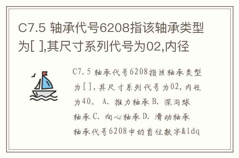 C7.5 轴承代号6208指该轴承类型为[ ],其尺寸系列代号为02,内径为40。 A. 推力轴承 B. 深沟球轴承 C. 向心轴承 D. 滑动轴承