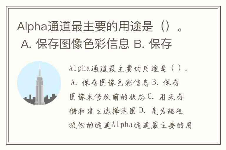 Alpha通道最主要的用途是()。 A. 保存图像色彩信息 B. 保存图像未修改前的状态 C. 用来存储和建立选择范围 D. 是为路径提供的通道