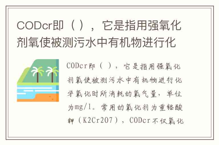 CODcr即( ),它是指用强氧化剂氧使被测污水中有机物进行化学氧化时所消耗的氧气量,单位为mg/l。常用的氧化剂为重铬酸钾(K2Cr2O7),CODcr不仅氧化污水中的有机物,而且对部分无机物也有氧化作用,另外,污水中Cl-也会消耗一部分氧化剂,因此造成测定时CODcr数值偏高。 A. 生化需氧量 B. 化学需氧量 C. 理化需氧量 D. 生物需氧量