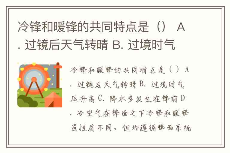 冷锋和暖锋的共同特点是() A. 过镜后天气转晴 B. 过境时气压升高 C. 降水多发生在锋前 D. 冷空气在锋面之下