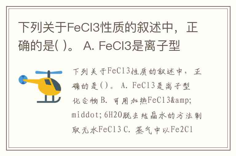 下列关于FeCl3性质的叙述中,正确的是( )。 A. FeCl3是离子型化合物 B. 可用加热FeCl3·6H2O脱去结晶水的方法制取无水FeCl3 C. 蒸气中以Fe2Cl6分子存在 D. 在一般条件下既可被氧化也可被还原