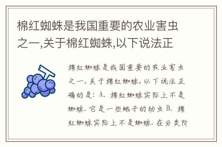 棉红蜘蛛是我国重要的农业害虫之一,关于棉红蜘蛛,以下说法正确的是: A. 棉红蜘蛛实际上不是蜘蛛.它是一些蛾子的幼虫 B. 棉红蜘蛛实际上不是蜘蛛.在分类阶元上属蛛形纲螨蜱目,它与蝎子的关系较与蜈蚣的关系近 C. 棉红蜘蛛身体前端的头部主要由附肢组成.只有眼而无脑.称之为“假头” D. 棉红蜘蛛也常常吸食一些鸟类或哺乳动物的血液。