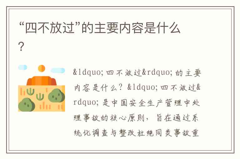 “四不放过”是中国安全生产管理中处理事故的核心原则,旨在通过系统化调查与整改杜绝同类事故重复发生。其核心内容包括四个刚性要求:事故原因未查清不放过、责任人员未处理不放过、整改措施未落实不放过、有关人员未受到教育不放过,这一原则已被明确写入《国务院办公厅关于加强安全工作的紧急通知》等法规文件,成为全国安全生产监管的重要依据。