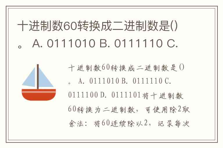 将十进制数60转换为二进制数,可使用除2取余法:将60连续除以2,记录每次的余数,直至商为0,再将余数倒序排列。具体步骤如下: