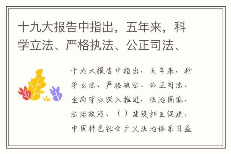 十九大报告中指出,五年来,科学立法、严格执法、公正司法、全民守法深入推进,法治国家、法治政府、()建设相互促进,中国特色社会主义法治体系日益完善。