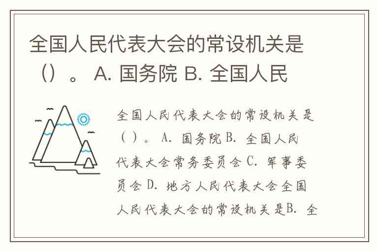 全国人民代表大会的常设机关是()。 A. 国务院 B. 全国人民代表大会常务委员会 C. 军事委员会 D. 地方人民代表大会
