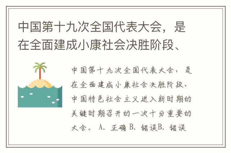 中国第十九次全国代表大会,是在全面建成小康社会决胜阶段、中国特色社会主义进入新时期的关键时期召开的一次十分重要的大会。 A. 正确 B. 错误