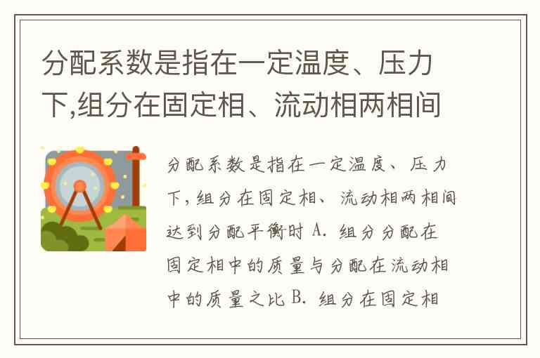 分配系数是指在一定温度、压力下,组分在固定相、流动相两相间达到分配平衡时 A. 组分分配在固定相中的质量与分配在流动相中的质量之比 B. 组分在固定相中的浓度与组分在流动相中的浓度之比 C. 流动相所占据的体积与固定相所占据的体积之比 D. 组分在流动相中的停留时间与组分在固定相中的停留时间之比
