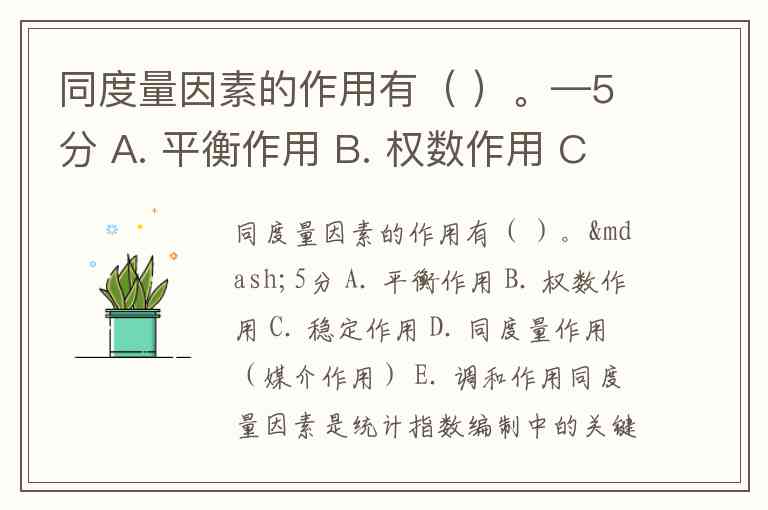 同度量因素的作用有( )。—5分 A. 平衡作用 B. 权数作用 C. 稳定作用 D. 同度量作用(媒介作用) E. 调和作用