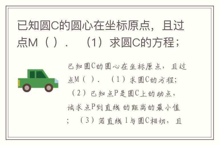 已知圆C的圆心在坐标原点,且过点M( ). (1)求圆C的方程; (2)已知点P是圆C上的动点,试求点P到直线 的距离的最小值; (3)若直线 l与圆C相切,且 l与 x, y轴的正半轴分别相交于A,B两点,求△ABC的面积最小时直线 l的方程.