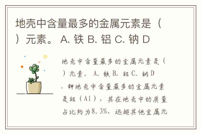 地壳中含量最多的金属元素是()元素。 A. 铁 B. 铝 C. 钠 D. 钾