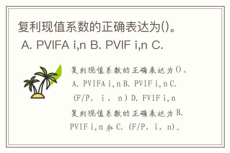 需要注意的是,选项A的 PVIFA 代表“年金现值系数”(Present Value Interest Factor of Annuity),用于计算一系列等额现金流的现值,与题目中的“复利现值系数”不符。选项D的 FVIF 则是“复利终值系数”(Future Value Interest Factor),公式为(1+i)ⁿ,与复利现值系数互为倒数。