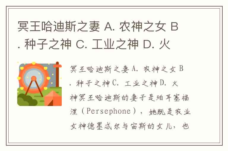 冥王哈迪斯的妻子是珀耳塞福涅(Persephone),她既是农业女神德墨忒尔与宙斯的女儿,也是希腊神话中掌管种子与四季更迭的女神。这一身份让她同时满足题目中的两个关键描述:作为德墨忒尔之女对应选项A“农神之女”,作为种子生长与地下丰产的象征对应选项B“种子之神”。