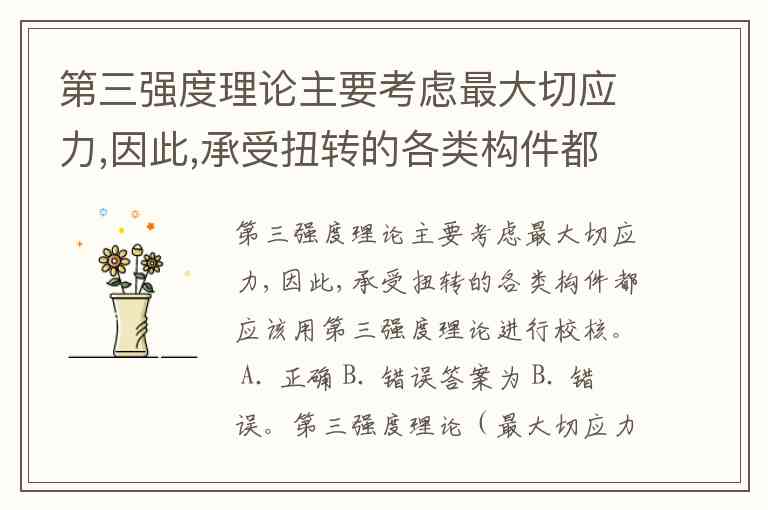答案为 B. 错误。第三强度理论(最大切应力理论)的核心是认为材料屈服由最大切应力引起,但其适用范围存在严格限制:仅适用于 塑性材料(如低碳钢)在以屈服形式失效的场景,而非所有承受扭转的构件。
