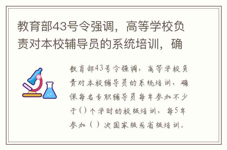 教育部43号令明确了高校辅导员培训的量化标准,要求高等学校确保每名专职辅导员每年参加不少于 16个学时 的校级培训,每5年参加 1次 国家级或省级培训。这一规定构建了国家、省级和高校三级培训体系,旨在通过系统化培训提升辅导员队伍的职业化与专业化水平。