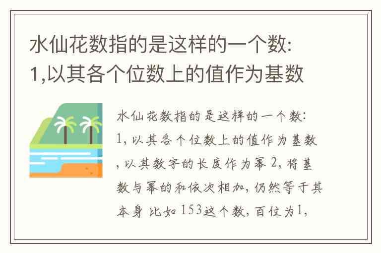 水仙花数指的是这样的一个数: 1,以其各个位数上的值作为基数,以其数字的长度作为幂 2,将基数与幂的和依次相加,仍然等于其本身 比如 153这个数,百位为1,十位为5,个位为3,数字总长度为3 153 = 1**3 + 5**3 + 3**3 = 1+ 125 + 27 =153 求5000以内的水仙花数 输入:无 输出:153 370 371 407 1634