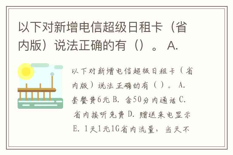 正确选项为A、D、E。需注意该套餐存在流量当日清零、省内流量限制等特点,且不同地区可能有细微差异(如部分版本为本地流量而非省内流量),建议通过电信官方渠道确认最新资费。如果是你,会优先考虑日租卡的流量灵活性还是通话时长呢?