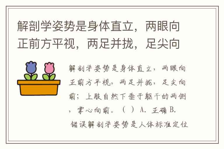 解剖学姿势是身体直立,两眼向正前方平视,两足并拢,足尖向前;上肢自然下垂于躯干的两侧,掌心向前。( ) A. 正确 B. 错误