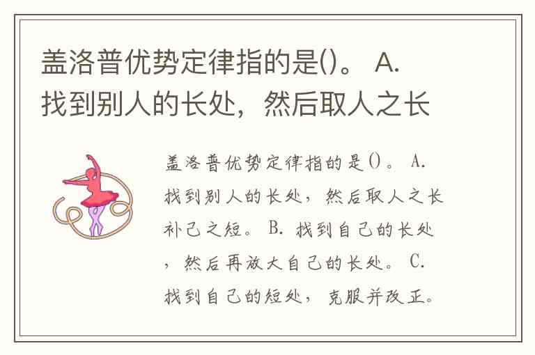 盖洛普优势定律指的是()。 A. 找到别人的长处,然后取人之长补己之短。 B. 找到自己的长处,然后再放大自己的长处。 C. 找到自己的短处,克服并改正。 D. 找到别人的短处,以凸显自己的长处。