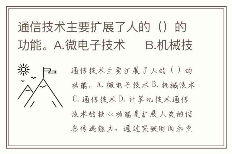 当前题目选项中虽未直接出现“信息传递”或“神经器官”,但结合技术本质与选项设置,通信技术作为信息技术的核心分支,其核心功能是扩展人类的信息传递能力,这一过程与选项中的“通信技术”(C选项)形成功能与名称的对应关系。值得注意的是,微电子技术(A)是硬件基础,机械技术(B)侧重物理运动,计算机技术(D)侧重数据处理,唯有通信技术本身直指“信息传递”这一核心扩展功能。