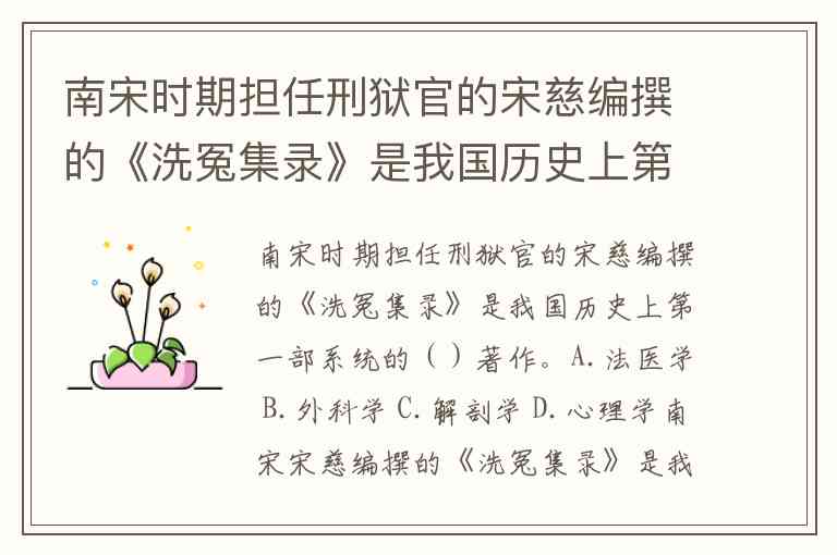 南宋时期担任刑狱官的宋慈编撰的《洗冤集录》是我国历史上第一部系统的()著作。A.法医学 B.外科学 C.解剖学 D.心理学