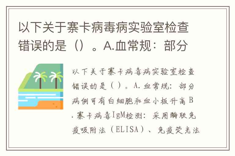 以下关于寨卡病毒病实验室检查错误的是A选项。寨卡病毒感染的血常规典型表现为白细胞和血小板减少,而非升高。这一特征与其他黄病毒科病毒(如登革热)类似,可能与病毒直接损伤造血细胞或免疫介导的血小板破坏有关。
