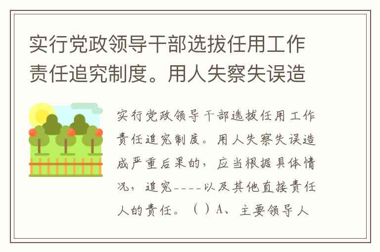 实行党政领导干部选拔任用工作责任追究制度,是《党政领导干部选拔任用工作条例》的明确要求,旨在通过严格问责机制确保选人用人质量。当用人失察失误造成严重后果时,需根据具体情况追究多主体责任,这一制度设计体现了“权责对等、失责必究”的原则。