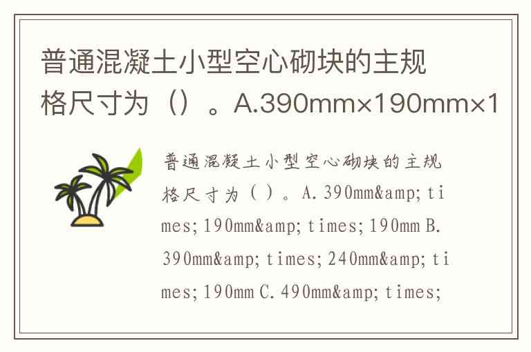 普通混凝土小型空心砌块的主规格尺寸为()。A.390mm×190mm×190mm B.390mm×240mm×190mm C.490mm×370mm×370mm D.370mm×240mm×240mm