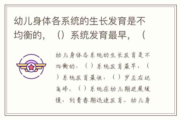幼儿身体各系统的生长发育是不均衡的,()系统发育最早,()系统发育最快,()岁左右达高峰。()系统在幼儿期进展缓慢,到青春期迅速发育。