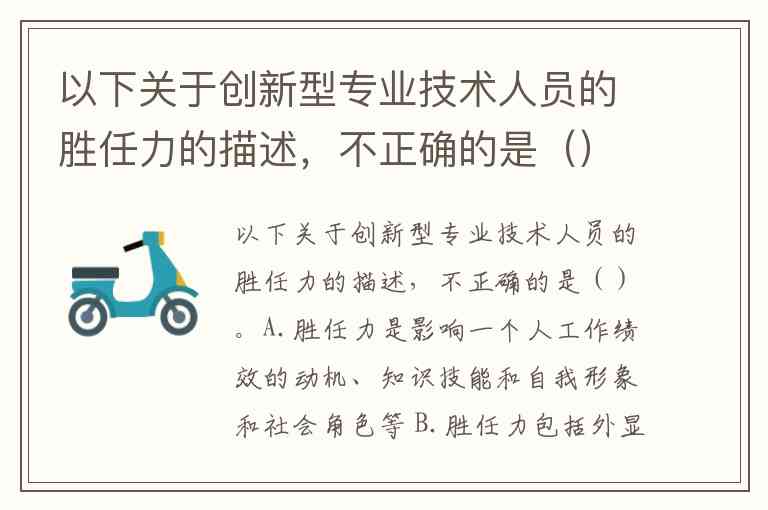 以下关于创新型专业技术人员的胜任力的描述,不正确的是()。A.胜任力是影响一个人工作绩效的动机、知识技能和自我形象和社会角色等 B.胜任力包括外显胜任力和内隐胜任力。外显胜任力中社会角色、个性、态度等影响胜任力的直接发挥 C.胜任力可以通过培训和发展加以改善和提高 D.胜任力可以通过广泛接受的标准进行测