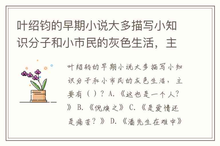 叶绍钧(叶圣陶)作为文学研究会“为人生”创作理念的代表作家,其早期小说以冷静客观的笔触刻画小知识分子与小市民的“灰色生活”著称,展现他们在时代夹缝中的软弱、自私与精神困境。根据文学史定位及作品主题,符合这一创作特征的代表作包括 《潘先生在难中》《这也是一个人?》,而《倪焕之》虽为其重要作品,却属于后期转型之作,《是爱情还是痛苦?》则非其创作。