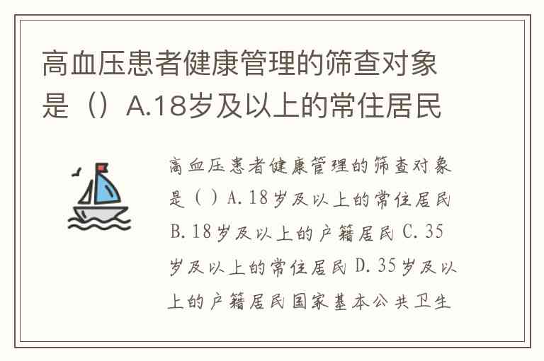 高血压患者健康管理的筛查对象是()A.18岁及以上的常住居民 B.18岁及以上的户籍居民 C.35岁及以上的常住居民 D.35岁及以上的户籍居民
