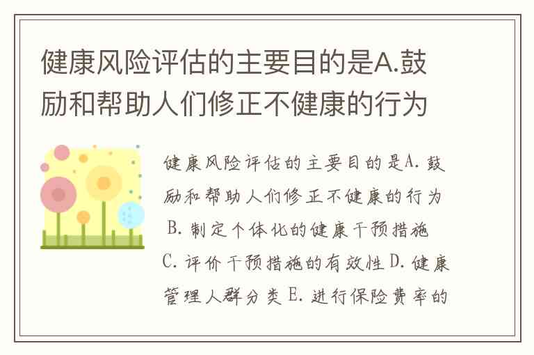健康风险评估的主要目的是A.鼓励和帮助人们修正不健康的行为 B.制定个体化的健康干预措施 C.评价干预措施的有效性 D.健康管理人群分类 E.进行保险费率的计算