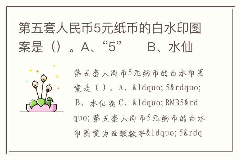 第五套人民币5元纸币的白水印图案是()。A、“5” B、水仙花 C、“RMB5”