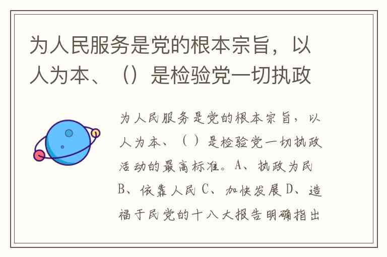 为人民服务是党的根本宗旨,以人为本、()是检验党一切执政活动的最高标准。A、执政为民 B、依靠人民 C、加快发展 D、造福于民