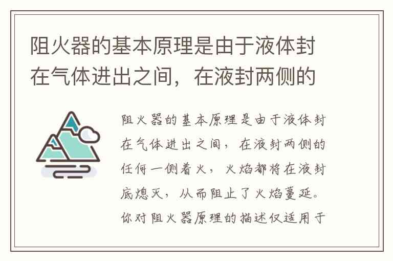 阻火器的基本原理是由于液体封在气体进出之间,在液封两侧的任何一侧着火,火焰都将在液封底熄灭,从而阻止了火焰蔓延。